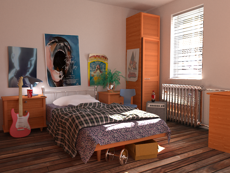 I granted the Luxrender version more rendering hours than the others, simply because I was away for three days in Amsterdam for the Blender conference and kept my desktop computer busy, rendering this scene. I think the weight between the two light sources works best for the images rendered so far. The dumbbell is similar to the Arnold version but should be more rusty. Also the red of the guitar should be changed in the common Blender scene (before exporting). I don’t like the radiator, it’s too shiny. Either my Blender material should be changed or the exporter has bad (Luxrender) heuristics for those kind of materials. Needs a bit of investigation. The aliasing artefacts around the blends (and the light bulb) are a known issue with Luxrender, but maybe there is a workaround, I’m not aware of (yet). What happened to the texture of the Clockwork Orange poster? Somehow the contrast is gone. Why does it not happen for the other textures? Is it the way it receives light?